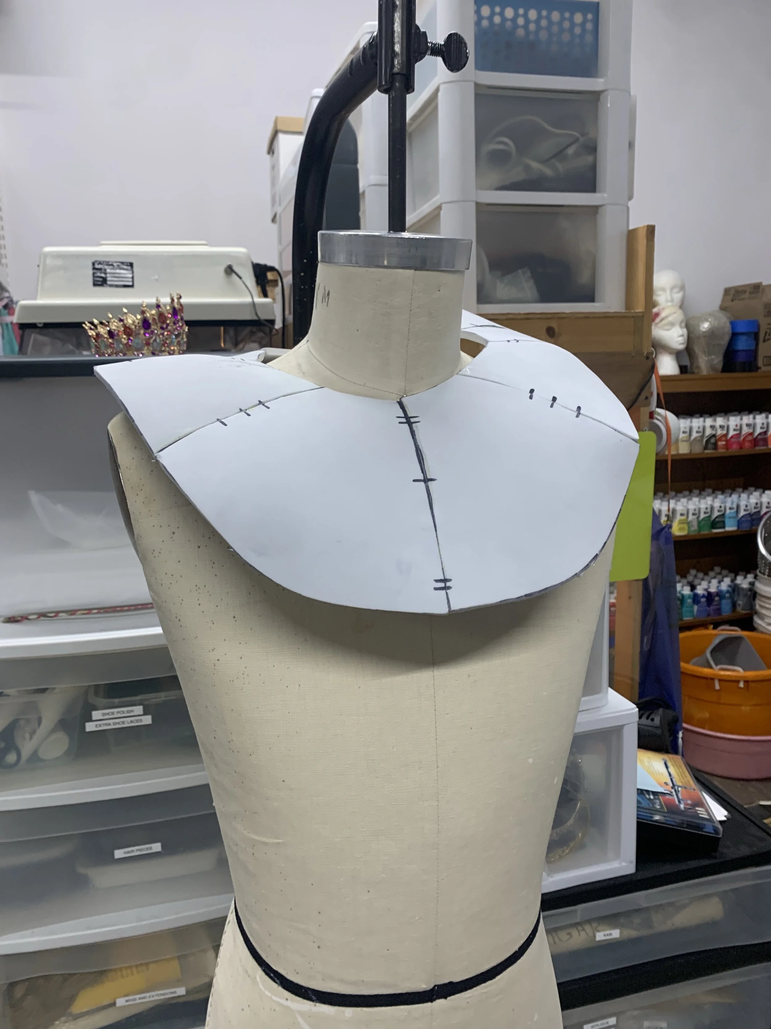 Acrylic painted EVA foam embellished with cut pieces of fabric